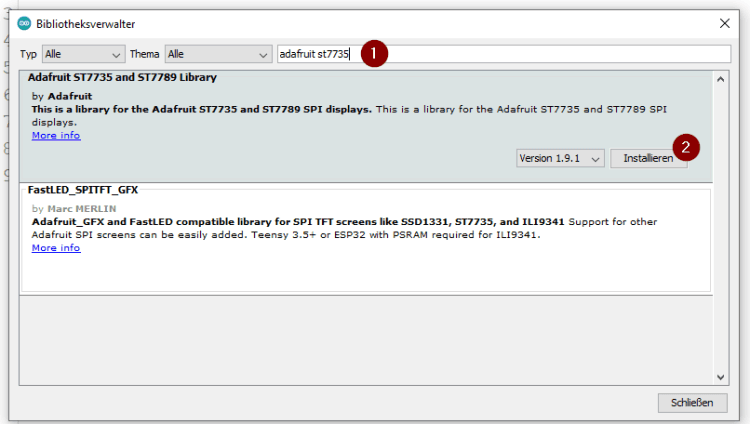 Der einfachste Weg die benötigte Bibliothek „Adafruit-ST7735“ zu installieren ist über den Bibliotheksverwalter der Arduino IDE. In dem geöffneten Bibliotheksverwalter suchen wir zunächst nach „adafruit st7735“ (1). Und wählen im Eintrag „Adafruit ST7735 and ST7709 Library by Adafruit“ die Schaltfläche „Installieren“.