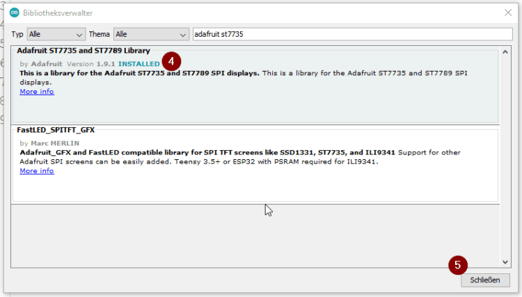 Bei erfolgreicher Installation wird der Text „INSTALLED“ (4) angezeigt und wir können den Bibliotheksverwalter über die Schaltfläche „Schließen“ (5) verlassen.