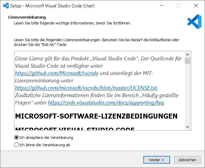 Nachdem die Installation von Node.JS abgeschlossen ist können wir Visual Studio Code von https://code.visualstudio.com/download herunterladen.