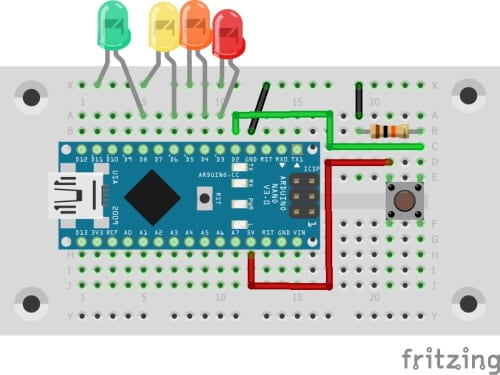 Wollen wir also nun folgendes Programm erstellen: Es soll ein Lauflicht aus den LEDs rot, gelb, grün erstellt werden, welches von links nach rechts läuft. Wenn der Taster betätigt wird, soll die orange farbige LED für 4 Sekunden leuchten.