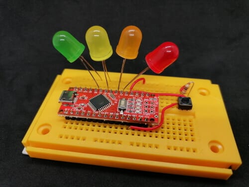 Wenn du den obigen Code auf den Mikrocontroller spielst, dann läuft das Lauflicht über die LEDs rot, gelb und grün. Sobald du nun den Taster betätigst, leuchtet die orange farbige LED für 3 Sekunden auf. Die Leuchtdauer kannst du im Code über die Konstante DURATION_LED_ACTIVE steuern.