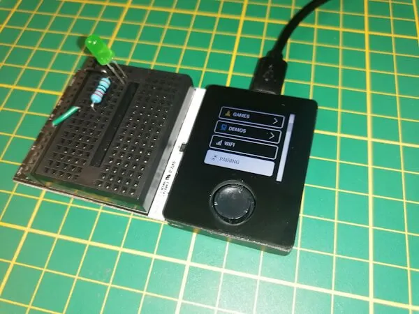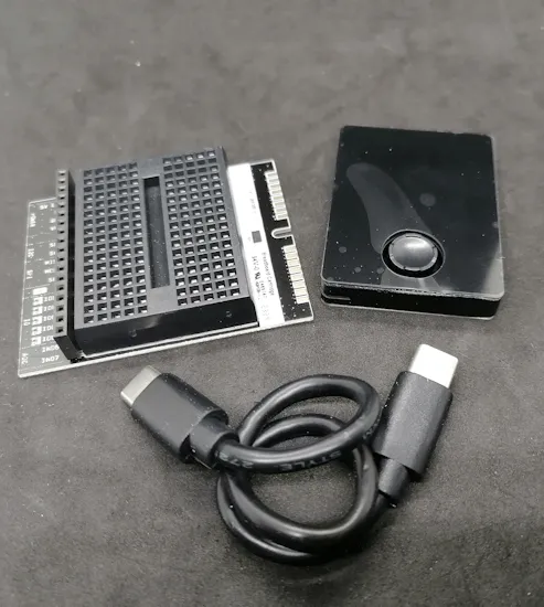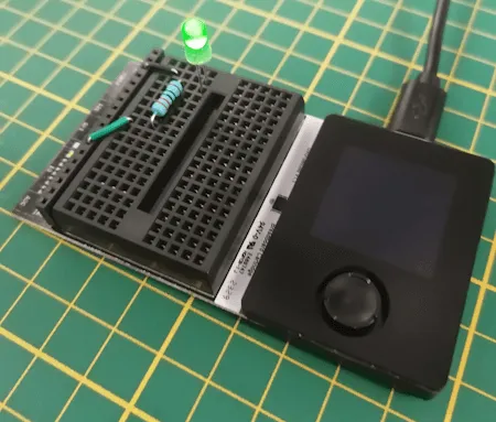 Der Mikrocontroller ist in einem 48 mm x 36mm x 7 mm Gehäuse gepackt welches über ein 24×240 RGB Farbdisplay und einem vierwege Joystick verfügt. An der Seite befindet sich eine Schnittstelle an welche man Module und Cartridges einstecken kann. Im Innventor Kit ist ein Breadboard Cartridge enthalten auf welchem du eine kleine Schaltung auf einem 170 Pin Breadboard erstellen kannst.