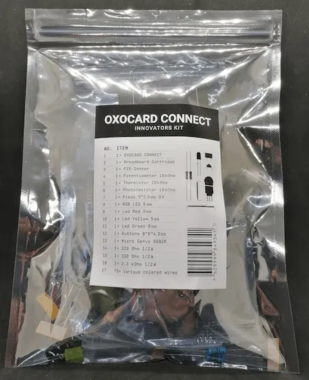 Wie erwähnt habe ich von der Firma Oxocard das Innovation Kit erhalten, in diesem ist neben dem Mikrocontroller und der Breadboard Cartridge noch diverse elektrische Bauteile enthalten mit welchen sich so einige Schaltungen aufbauen läßt.