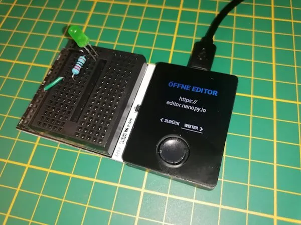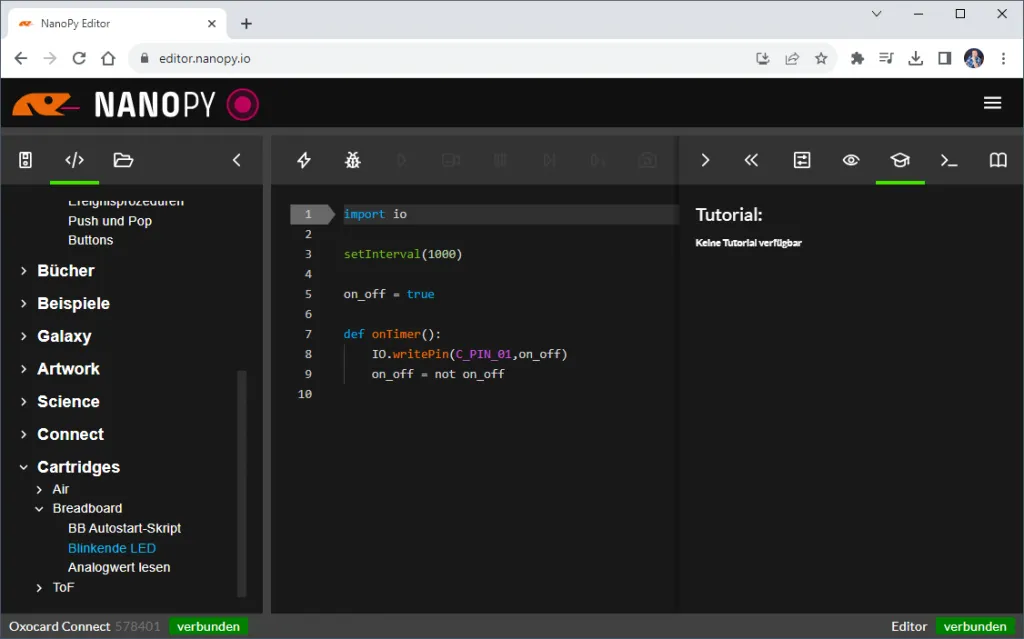 Eigentlich müssen wir nichts programmieren denn im NanoPi findest du unter Cartridges > Breadboard ein entsprechendes Beispiel welches wir mit nur zwei Klicks ausführen können.