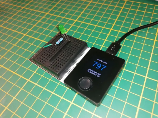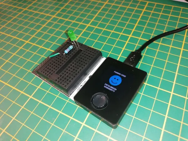 Über das Hauptmenü wähltst du zunächst den Punkt „Pairing“ und danach „Weiter“. Den dann angezeigten Code gibst du auf der Seite editor.nanopy.io ein und bestätigst diesen mit der Schaltfläche „Verbinden“. Wenn die Verbindung erfolgreich aufgebaut wurde wird dieses auf dem Mikrocontroller mit einem lachenden Smily angezeigt.