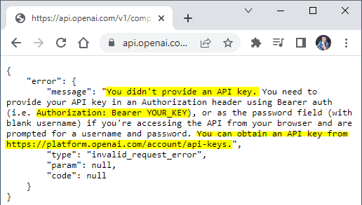 Den Request / die Anfrage stellen wir an die Adresse https://api.openai.com/v1/completions. Wenn wir diese in einem Browser öffnen würden, dann erhalten wir eine entsprechende Fehlermeldung, dass etwas fehlt.