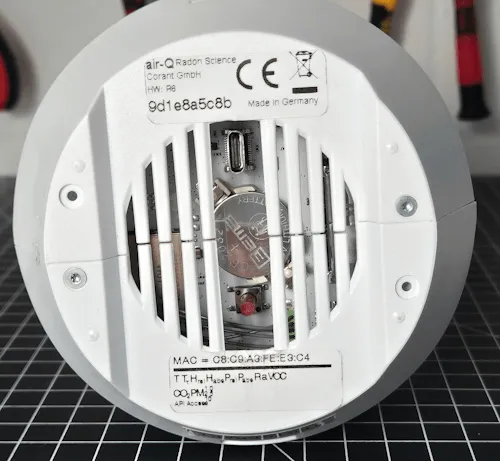 Auf der Unterseite des air-Q Radon findest du die USB-C-Buchse für die Stromversorgung sowie den RESET-Taster. Ebenfalls sichtbar sind zwei zusätzliche Bohrungen, die auf den ersten Blick an den Alu-Standfuß des größeren air-Q pro erinnern. Bei diesem Modell ist ein Ständer jedoch nicht notwendig – die breite Standfläche sorgt bereits für einen sicheren, stabilen Halt auf nahezu jeder Oberfläche.