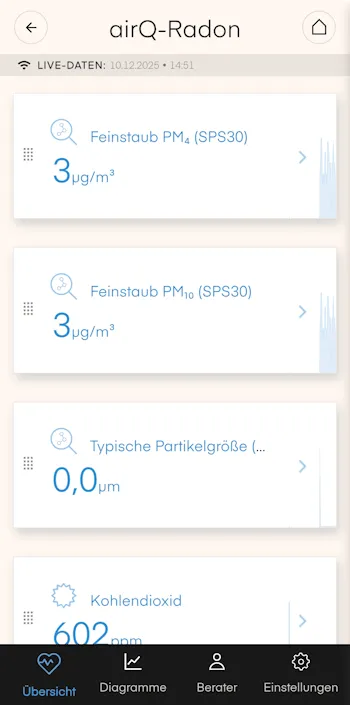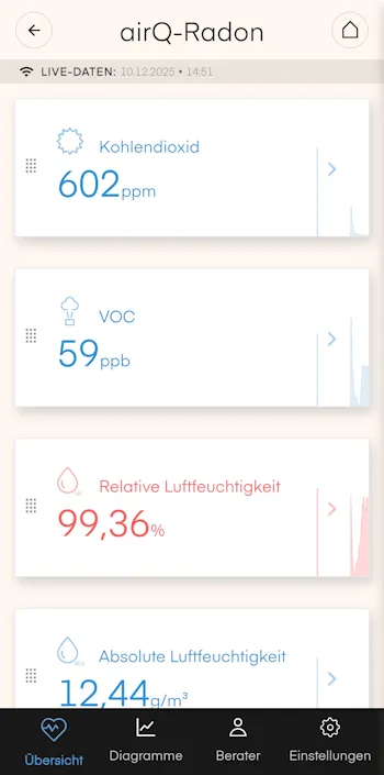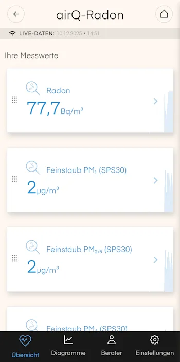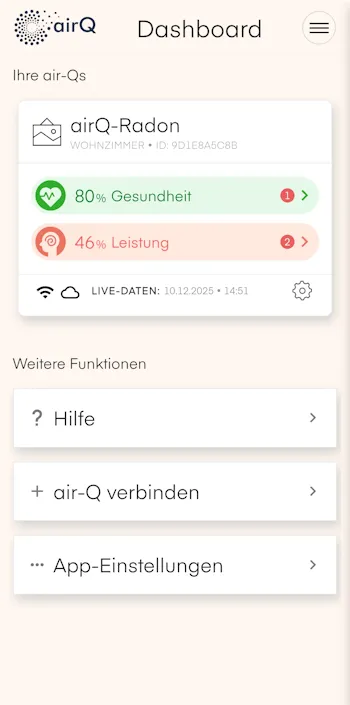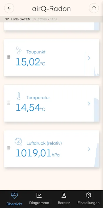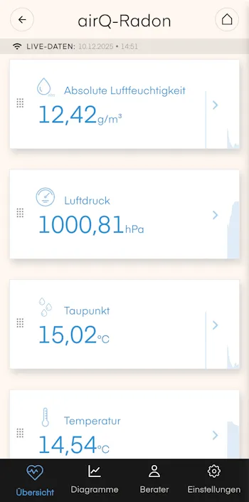 Die air-Q App bietet ein übersichtlich gestaltetes Dashboard, auf dem sich zahlreiche Sensordaten in Echtzeit ablesen lassen – von Radonwerten über VOC-Belastung bis hin zu Temperatur, Luftdruck und mehr.