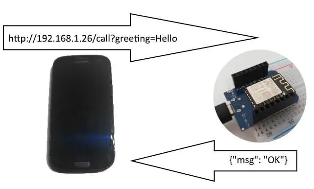 Das Android Gerät sendet einen Request an den ESP in dem dieser eine HTTP Adresse aufruft. An diese Adresse können HTTP GET Parameter angehängt und vom ESP ausgewertet werden. Als Ergebnis sendet der ESP ein Respond mit einem JSON String.