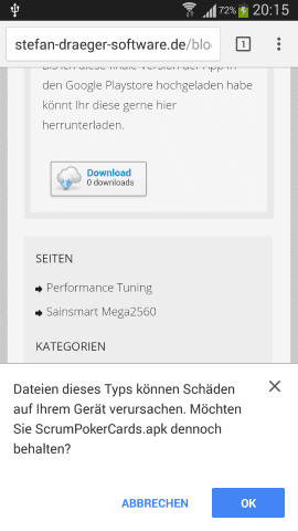 Wenn man auf der Seite Android App “ScrumPokerCards” den Download Link ausführt, so wird man in einem Dialog auf die Gefahren hingewiesen.