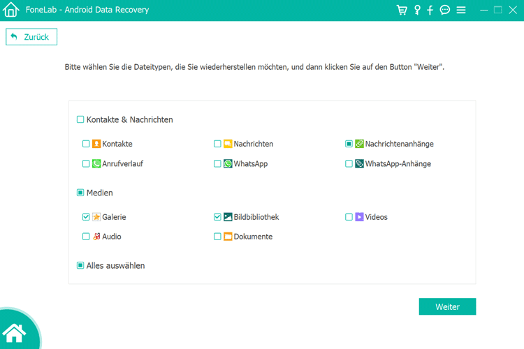 Schritt 3: Als Nächstes kannst du verschiedene Dateitypen anschauen, wie z.B. Kontakte, Nachrichten, Anrufverlauf, Galerie, Audio usw. Wähle die Dateitypen „Galerie“ und „Bildbibliothek“ aus. Dann klicke unten auf den Button „Weiter“.
