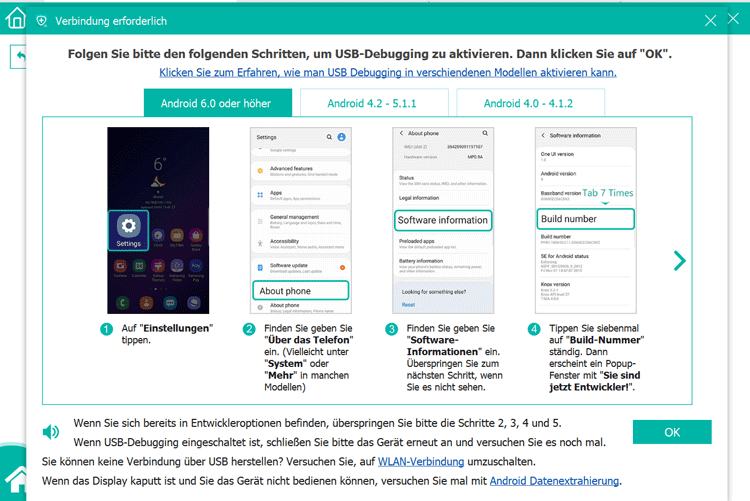 Schritt 2: Tippe auf „Einstellungen“ > „Entwickleroption“ auf dem Android-Handy, um das USB-Debugging auf dem Android-Handy zu aktivieren. Mit dem Root-Zugriff erscheint eine Nachricht auf dem Android-Bildschirm, dann tippe einfach auf „OK“, damit die Software dein Handy scannen kann.