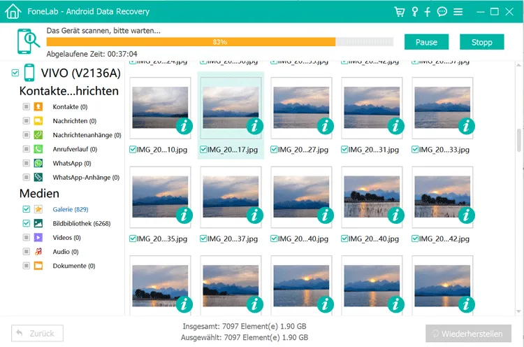 Schritt 4: Nachdem der Scanvorgang abgeschlossen ist, werden alle gefundenen Bilder von dem Android-Handy angezeigt. Klicke in der linken Spalte auf „Galerie“ und „Bildbibliothek“ und wähle die gewünschten Bilder aus, die du von deinem Android-Handy wiederherstellen magst.