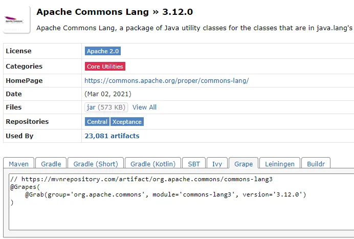groovy> @Grab(group='org.apache.commons', module='commons-lang3', version='3.12.0')