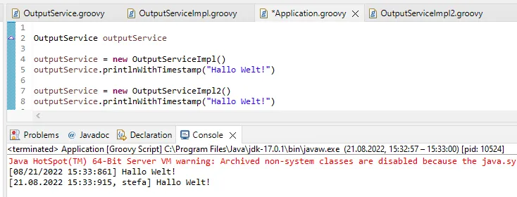 Kommen wir nun zur Groovy Magic mit Interfaces. Wenn wir eine „normale“ Klasse mit den Methoden aus dem Interface implementieren, ohne das Interface selber zu implementieren, dann können wir eine Instanz von dieser Klasse in das Interface umwandeln.