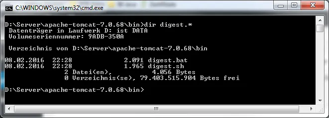 Apache Tomcat wird mit einem Script ausgeliefert, welches Passwörter im Format „SHA-256“ verschlüsselt. Dieses Skript ist im %TOMCAT_HOME%\bin Ordner abgelegt und heißt für Windowsbenutzer „digest.bat“, Linuxbenutzer wählen hier die Datei „digest.sh“.