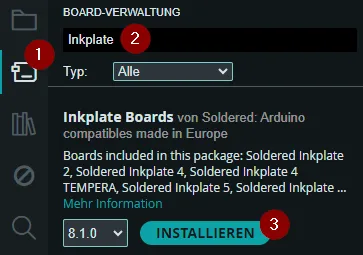 Im Boardbverwalter (1) suchen wir nun nach Inkplate (2) und wählen am Eintrag „Inkplate Boards von Soldered“ die Schaltfläche INSTALLIEREN (3).