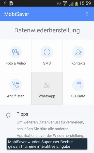 Wenn nun die App „MobiSaver“ gestartet wird, wird man aufgefordert entweder dieser App die entsprechenden Root Rechte zu geben (Schaltfläche „Erlauben“) oder aber zu verweigern (Schaltfläche „Verweigern“). In meinem Fall wähle ich die Schaltfläche „Erlauben“. Nun präsentiert sich die App ohne den zusätzlichen Hinweistext und man sieht „nur“ die Kacheln der einzelnen Funktionen.