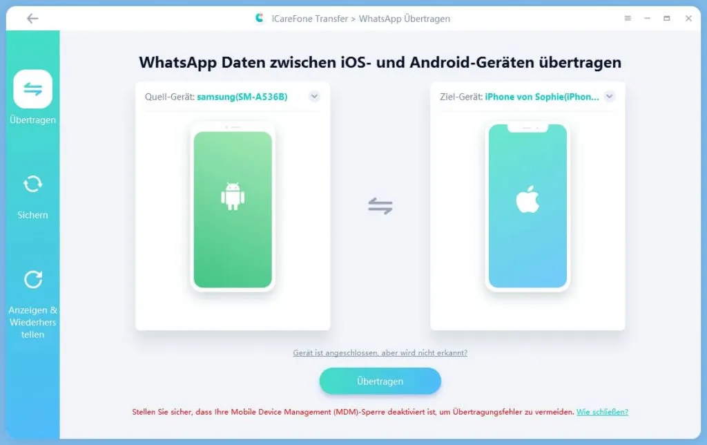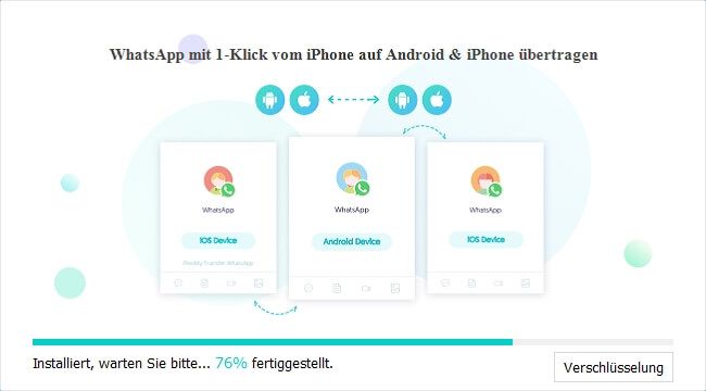 Eine Kernfunktion der Software ist die Übertragung der Daten zwischen den beiden Systemen Android & iPhone.