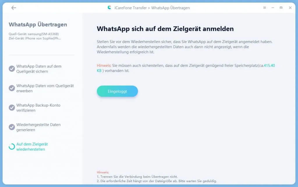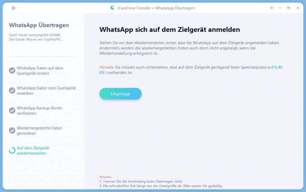 Laut Hersteller soll dieses ohne Datenverlust geschehen. In meinem Fall wollte ich von einem Samsung A53 auf ein iPhone8 die Daten übertragen. Jedoch wurde beim Zielgerät (dem iPhone8) sämtliche Daten in WhatsApp gelöscht. Was zunächst schlimm klingt, aber da zuvor ein Backup erstellt wurde, konnten die Daten wiederhergestellt werden.