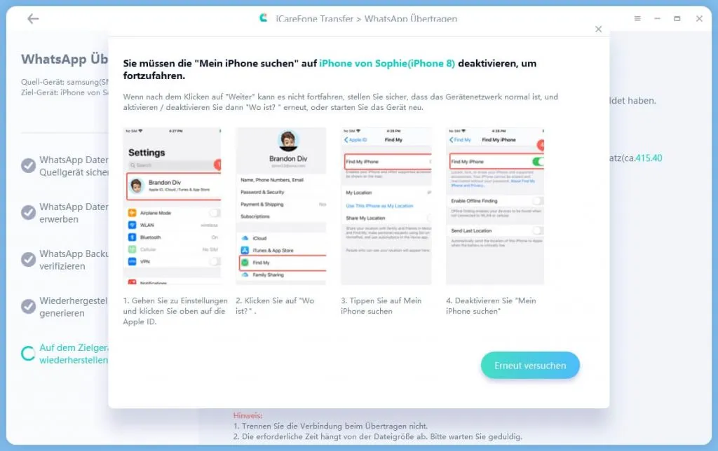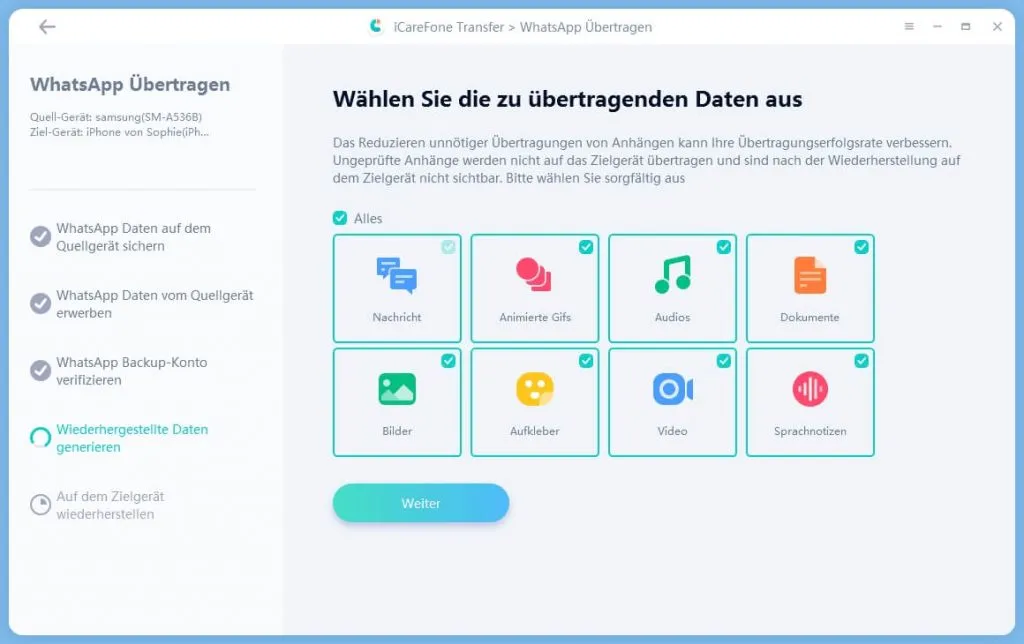 Wenn man die Sicherung durchgeführt hat (würde ich definitiv empfehlen) muss noch eine Einstellung auf dem iPhone getroffen werden und danach kann ausgewählt werden welche Daten übertragen werden sollen.