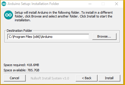In diesem Dialog kann der Ordner in welchem die Arduino IDE installiert werden soll geändert werden (Schaltfläche „Browse…“). Wenn Sie einen Ordner gewählt haben oder mit der Voreinstellung zufrieden sind, wird die Installation mit der Schaltfläche „Install“ gestartet.