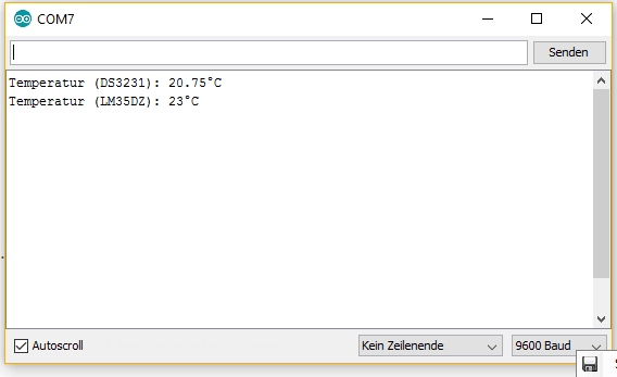 Zum Vergleichen der Temperatur habe ich einen LM35DZ Sensor integriert und die Ausgabe auf den seriellen Monitor umgeleitet.