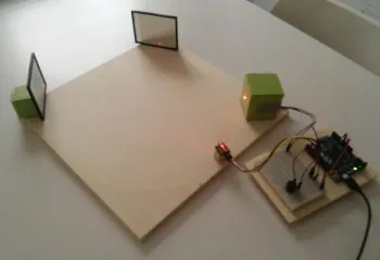 Dazu baue ich mit einer Sperrholzplatte zwei Taschenspiegel und dem Laserpointer Modul und Laser Sensor. Der Lasersensor ist in einem eigenen Gehäuse verpackt und lässt das Licht nur durch eine 8 mm große Öffnung an der Vorderseite durch.