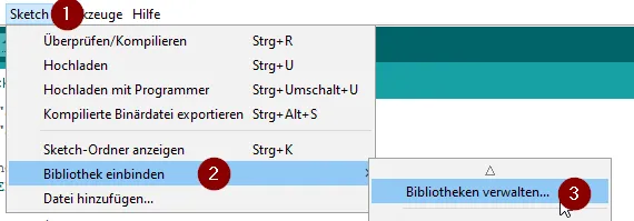 „Sketch“(1) -> „Bibliothek einbinden“ (2) -> „Bibliotheken verwalten…“ (3)