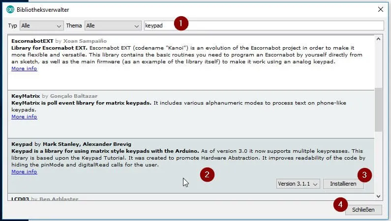 Es sollte sich nun der Bibliotheksverwalter öffnen. In diesem neuen Dialog wird zuerst nach dem Begriff „keypad“ (1) gesucht.