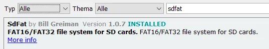 Des Weiteren wird die Bibliothek SDFat benötigt. Diese kann man auch über den Bibliotheksverwalter installieren.