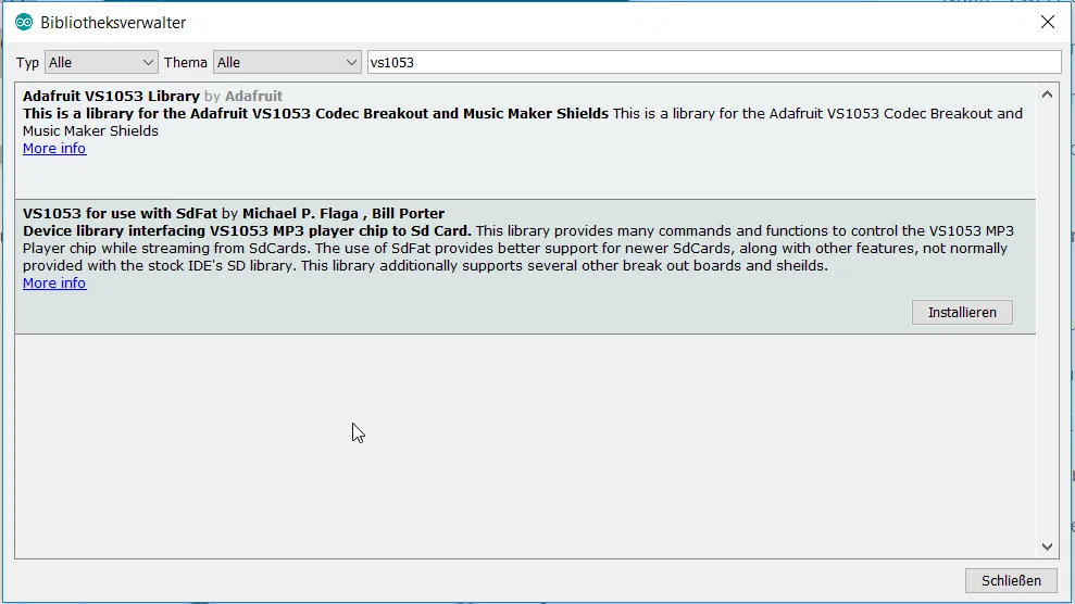 Für den nachfolgenden Sketch wird die Bibliothek Arduino_Library-vs1053_for_SdFat benötigt welche vom GitHub Repository des Entwicklers Michael P. Flaga heruntergeladen werden kann.