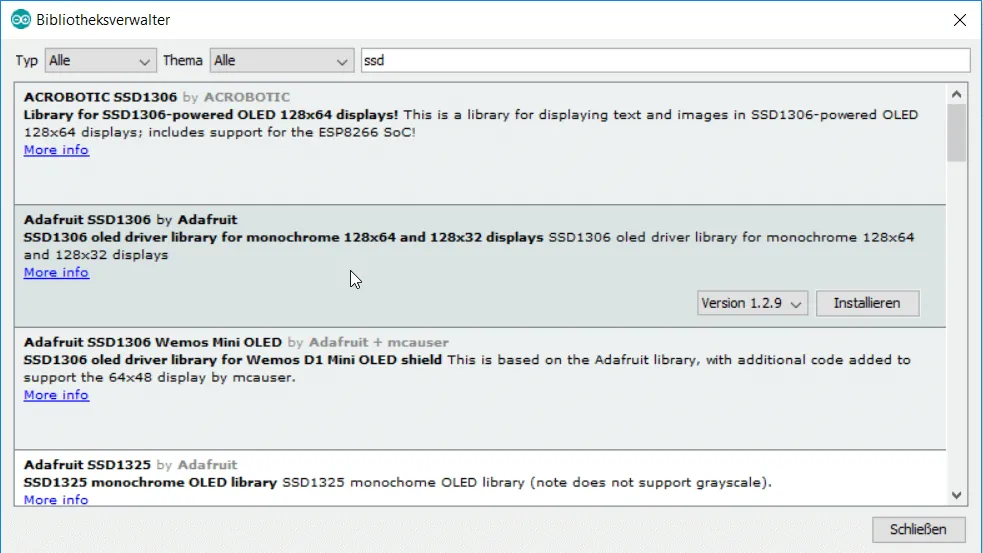 Für den Betrieb des Displays verwende ich die Bibliothek SSD1306 von Adafruit, welche über den Bibliotheksverwalter installiert wird.