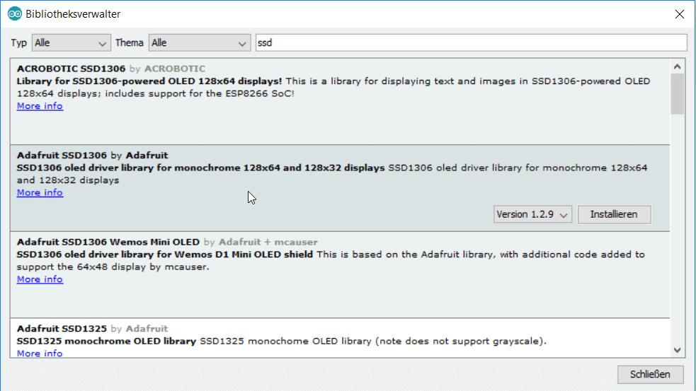 Für den Betrieb des Displays verwende ich die Adafruit Bibliothek SSD1306 in der Version 1.2.9. Die Bibliothek kann über den „Bibliotheksverwalter“ installiert werden.