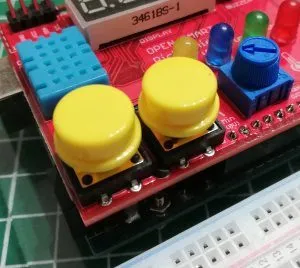 Da das Rich Shield neben dem DHT11 Sensor, auch über eine 4fach 7 Segmentanzeige und zwei Taster verfügt, wollen wir diese nutzen, um die Daten nicht auf den seriellen Monitor uns anzeigen zu lassen, sondern eben über diese 4fach 7 Segmentanzeige. Dazu nutzen wir die Taster um zwischen den Werten für die relative Luftfeuchtigkeit (H), der Temperatur in °C (C) und der Temperatur in °F (F) zu wechseln.