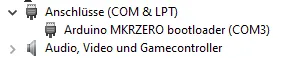 Dann sollte der Mikrocontroller eingebunden werden und im Geräte-Manager als „Arduino MKRZERO bootloader (COM3)“ angezeigt werden.