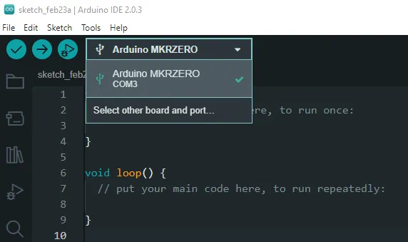 In der Arduino IDE muss dann der Mikrocontroller mit dem korrekten Port ausgewählt und ein leerer Sketch hochgeladen werden.