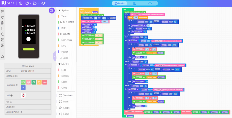 Nach diesem einmaligen Schritt lassen sich beide Mikrocontroller direkt aus UIFlow heraus per USB oder über die Cloud mit neuen Projekten bespielen. Ein erneutes Flashen ist dafür nicht notwendig.