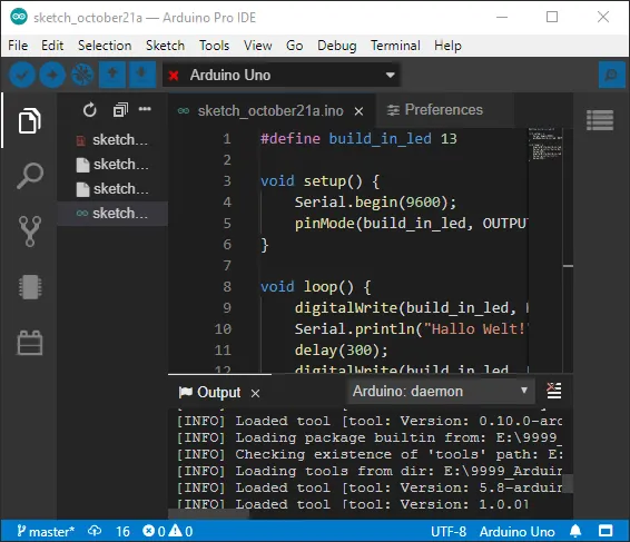 Wir können also nun ein kleines Sketch in der Arduino Pro IDE auf einen Mikrocontroller laden. (In meinem Fall werde ich einen Arduino UNO verwenden.)