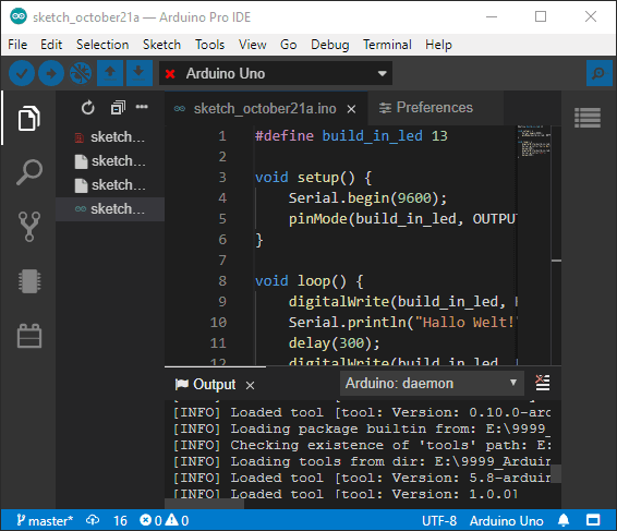 Wir können also nun ein kleines Sketch in der Arduino Pro IDE auf einen Mikrocontroller laden. (In meinem Fall werde ich einen Arduino UNO verwenden.)