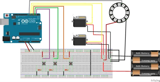 Die beiden Servos haben leider in der Grafik dieselbe Drahtfarbe, hier schwächelt die Software Fritzing etwas aber das wird wohl in einem kommenden Update berücksichtigt.