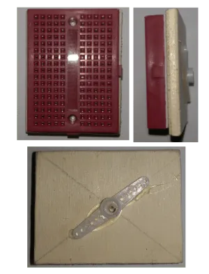 Dazu habe ich ein Breadboard mit doppelseitigem Klebeband auf ein kleines Holzbrettchen geklebt und unter dieses das Ruderhorn