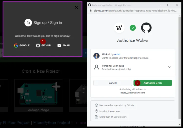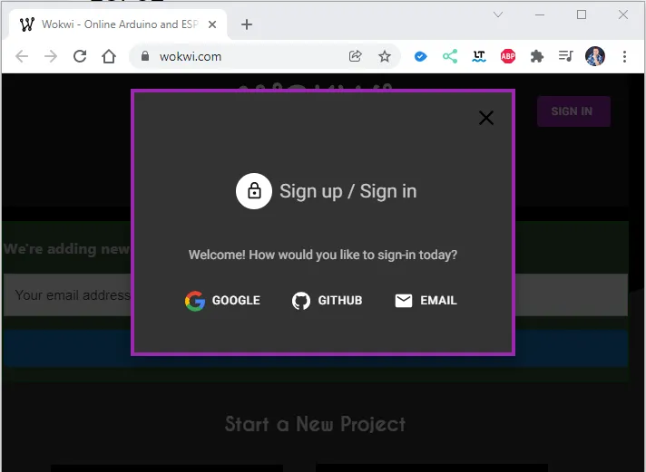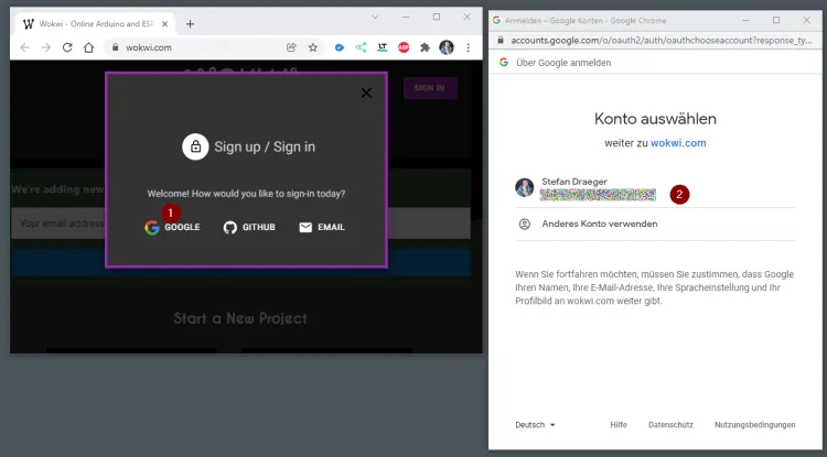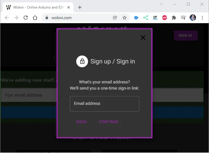 Um zusätzliche Services (das Community Forum, einen Discord) nutzen zu können, müssen wir uns an Wokwi anmelden.