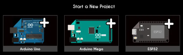 Um eine erste Schaltung zu erstellen, müssen wir auf der Hauptseite zunächst einen der drei Mikrocontroller auswählen.