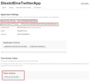 Es wurde nun auch schon der „Consumer Key (API Key)“ sowie der „Consumer Secret“ erstellt. Für die Verwendung der Twitter API benötigen wir jedoch noch den „Access Token“ sowie den „Access Token Secret“ die erzeugen wir durch das Betätigen der Schaltfläche „Create my access token“