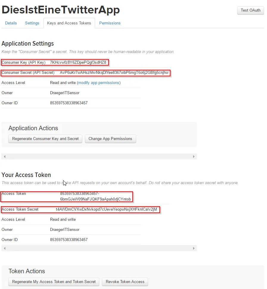 Damit haben wir nun die Daten für die Verwendung der Twitter API.