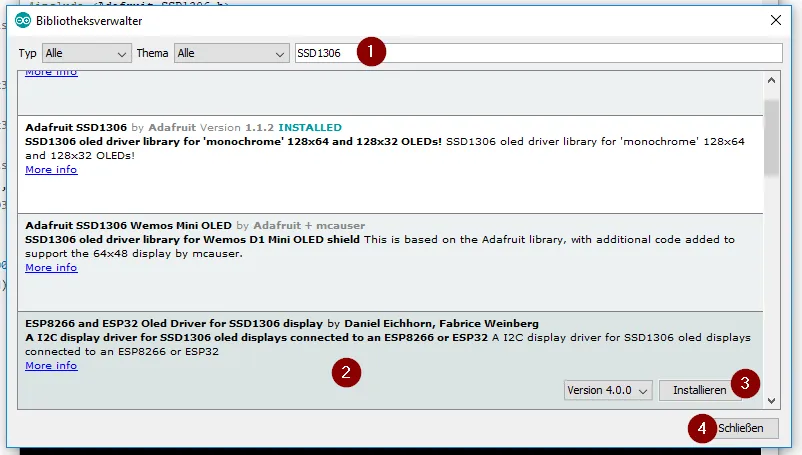 Es sollte sich nun nach einer kurzen Ladezeit der Boardverwalter öffnen. In diesem Dialog suchen wir zunächst nach dem Eintrag „SSD1306“ (1) danach wird der Eintrag „ESP8266 and ESP32 Oled Driver for SSD1306 ….“(2) ausgewählt. Nun noch die Schaltfläche „Installieren“ (3) betätigen. Nachdem die Installation erfolgreich war, kann der Dialog mit der Schaltfläche „Schließen“ (4) geschlossen werden.