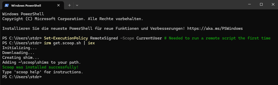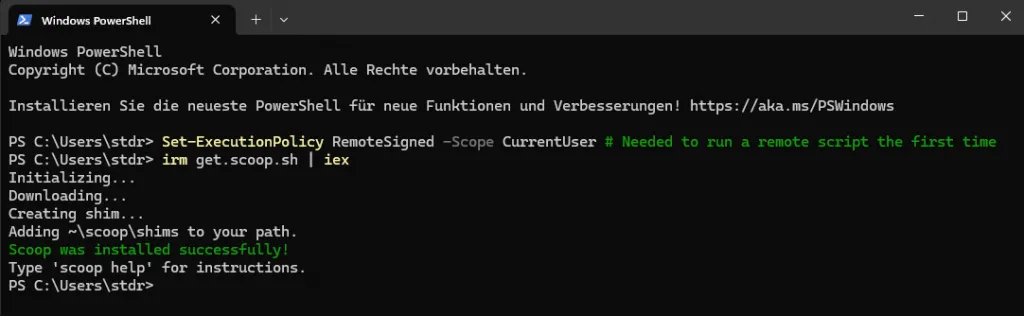 Scoop ist ein Paketmanager für Windows-Systeme, welchem man mit dem nachfolgenden Befehl über PowerShell nachinstallieren kann: