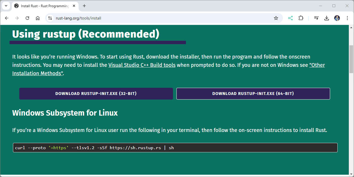 Den Rust Compiler kannst du unter https://www.rust-lang.org/tools/install kostenfrei als 32Bit & 64Bit Version herunterladen. In meinem Fall nehme ich die 64Bit Version.
