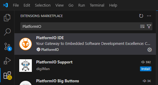 Wenn du Visual Studio Code installiert hast, dann kannst du die Erweiterung PlatformIO mit nur einem Klick über die „Extensions“ installieren.